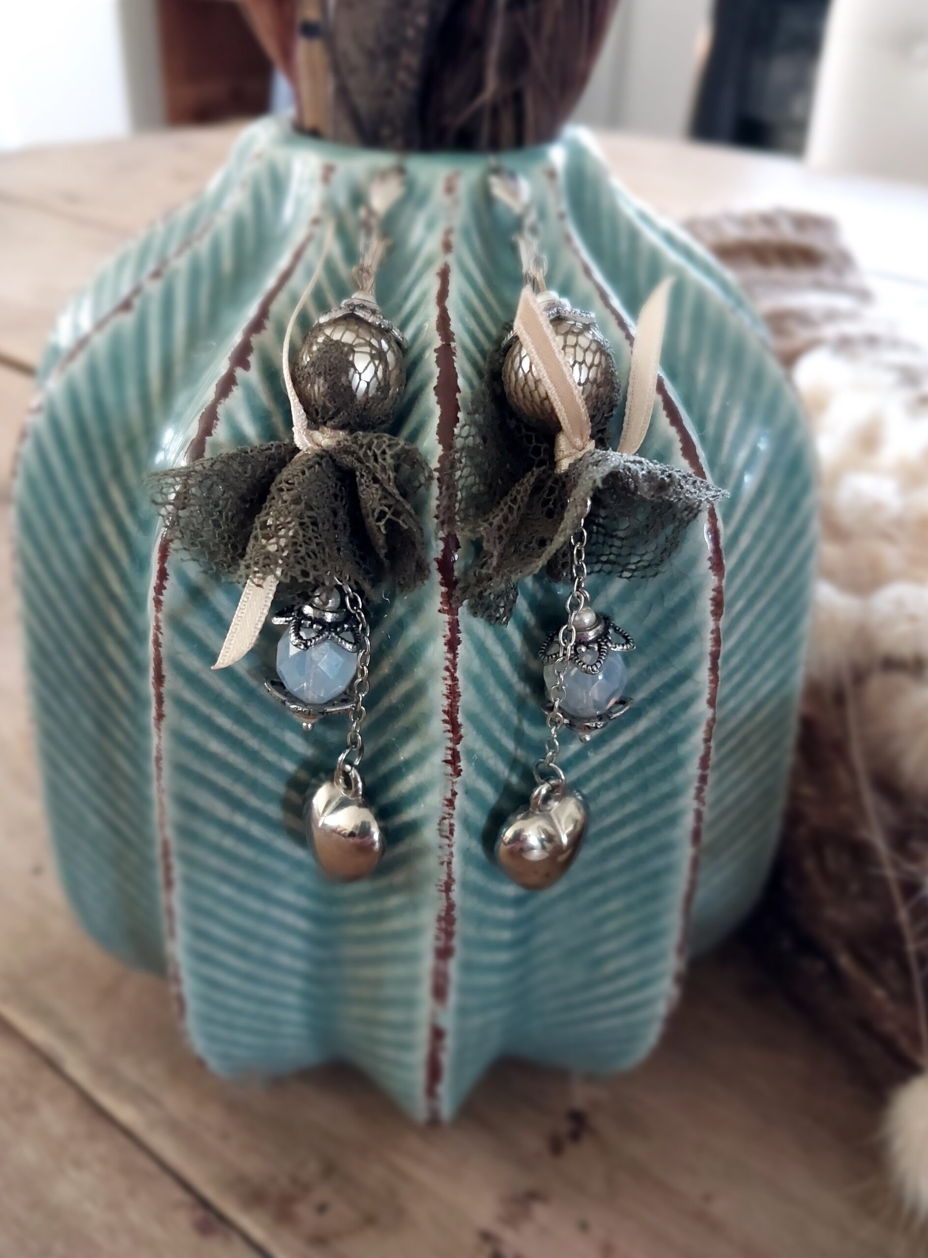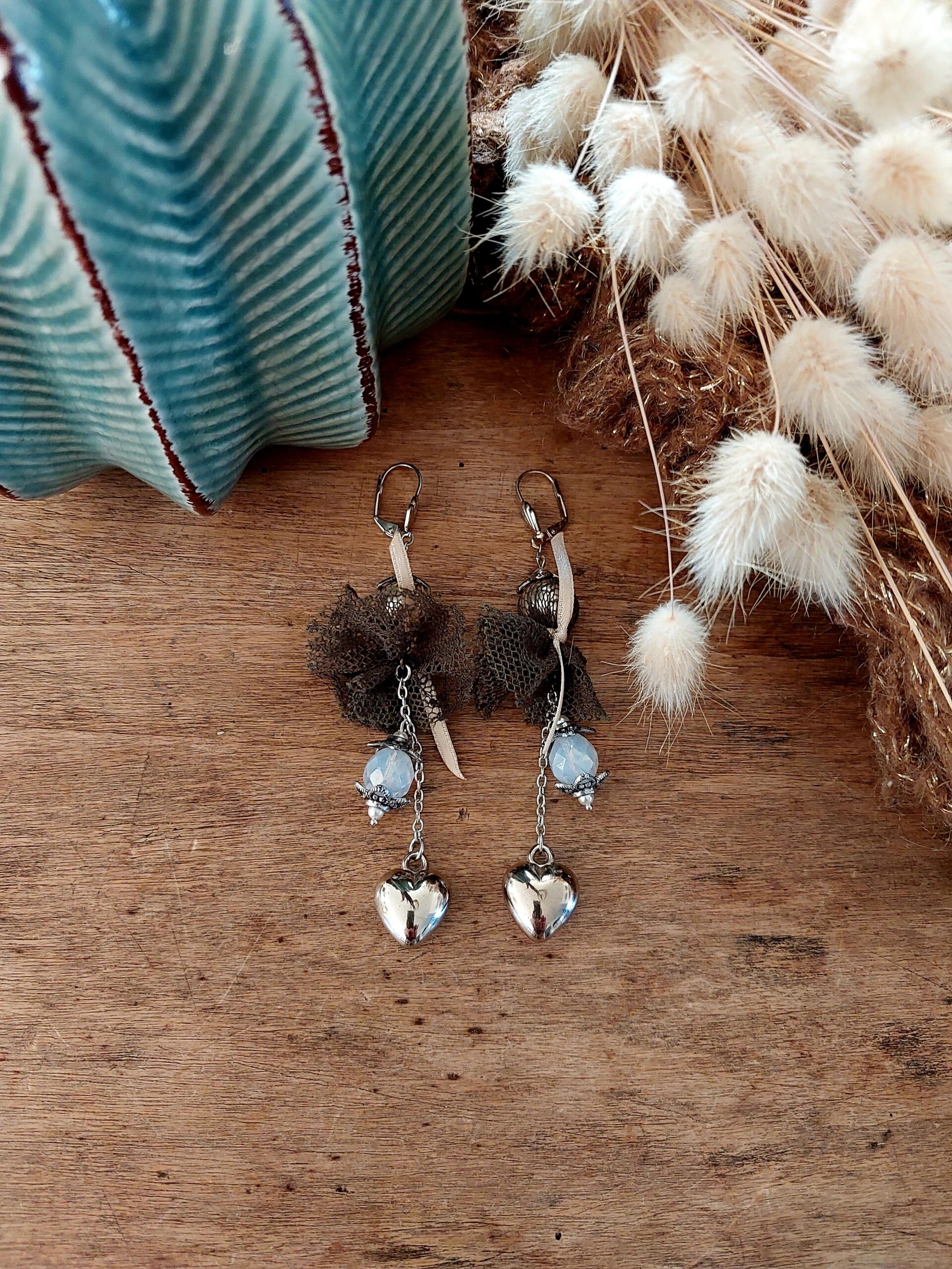 Boucles d’oreilles d’un style rétro chic, intemporel et romantique avec sa gamme de dentelle, cœur, de perles et de métal argenté inoxydable.